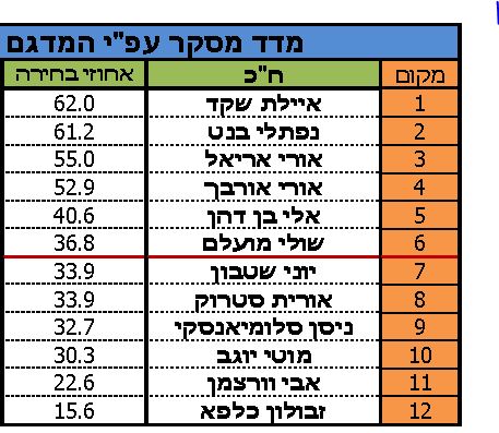 בחלק התחתון של הטבלה, שטבון, שטרוק וסלומינסקי עם 33% תמיכה מעט אחריהם מוטי יוגב עם 30%, ואת הרשימה סוגרים אבי וורצמן עם 22% תמיכה וזבולון כלפא עם 15% בלבד.