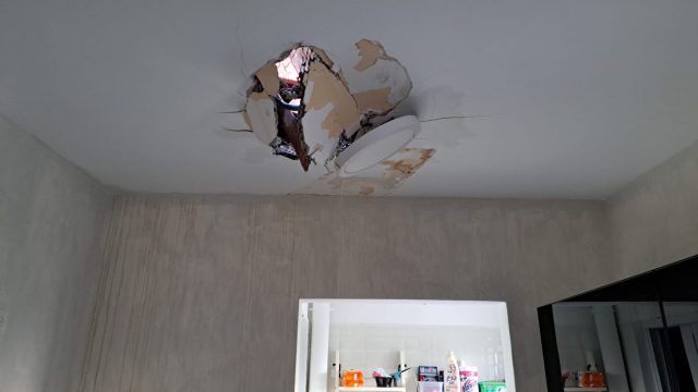 בעקבות הרוח החזקה הדוד החשמלי והקולט נותקו ממקומם, עפו מגג הבית ופערו חור בתקרת דירה בקומה האחרונה והסבו נזק וסכנה מיידית.