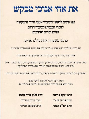 במכתב עליו חתומים בין השאר: הרב שמואל אליהו, הרב זלמן מלמד, והרב יעקב אריאל. פנו הרבנים לציבור הרחב וכתבו: "יש בינינו חילוקי דעות, אבל כולנו רוצים את טובת העם וטובת המדינה. אסור שחילוקי הדעות עם כל חריפותם יפגעו חס וחלילה באחדותנו".