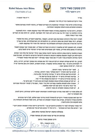 "היות וכל מי שהתעמק בסוגייה המתייחסת ללוד כעיר מוקפת חומה – הגיע למסקנה ברורה וחלוטה כי העיר לוד בה אנו גרים היא העיר לוד העתיקה. לפיכך, יש לחוג את חג הפורים בעיר בט"ו באדר בלבד", כתב הרב ביטון בפתח מכתבו.