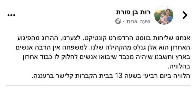 רות בן פורת, חברת קהילה בווסט הרטפורד, ביקשה בחשבון הפייסבוק שלה שאנשים יגיעו מחר (רביעי) לחלוק כבוד אחרון לאלן גנלס הי"ד שנרצח אמש בפיגוע ירי בכביש 90.