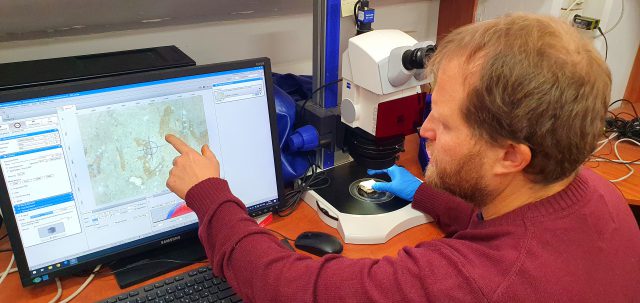 בחינת הכתובת תחת מיקרוסקופ במעבדות האנליטיות של רשות העתיקות. ( סער גנור, רשות העתיקות)