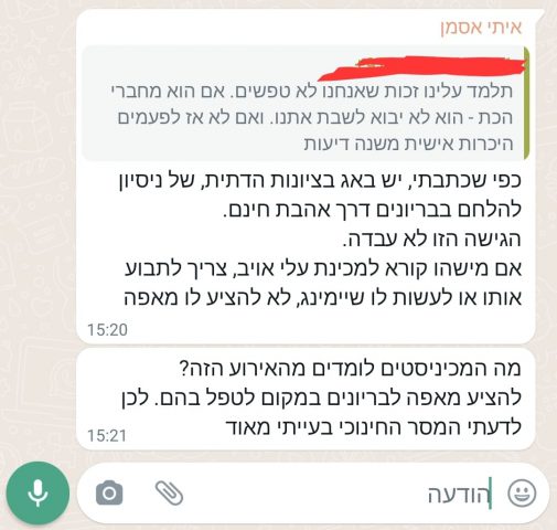 בהמשך הדיון הוא הוסיף: "יש באג בציונות הדתית, של ניסיון להילחם בבריונים דרך אהבת חינם. הגישה הזו לא עבדה. אם מישהו קורא למכינת עלי אויב – צריך לתבוע אותו או לעשות לו שיימינג, לא להציע לו מאפה".