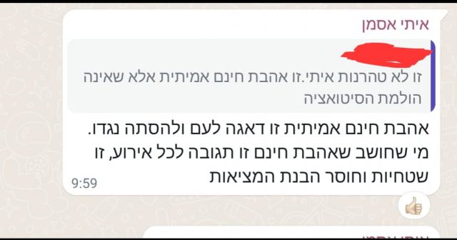 אסמן מסר בתגובה: "הדברים שהודלפו ל'סרוגים' מתוך קבוצה פנימית היו חלק מדיון ארוך, ולטובת מי שלא רוצה להסתפק מחצאי צילומי מסך מקוטעים, אשלים את התמונה. וחבל שהכתבת לא טרחה לפנות אליי לקבל תגובה כפי שנהוג כשכותבים נגד מישהו.