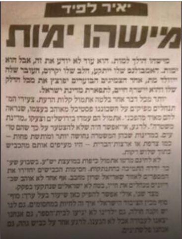 האמת שהייתי רוצה להתייחס למכתב שפעם כתב יאיר לפיד עוד כשהיה עיתונאי. שם הוא כותב האיש הזה הוא אחי. האיש ההוא העומד בהפגנות עם השלט מוות לערבים.. הוא בעצם אותו...