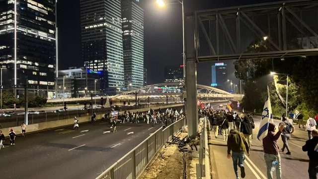בנוסף קבוצה גדולה של אוהדי הפועל תל אביב צועדת על איילון מכיוון מחלף רוקח, אחרי שיצאו מאולם הכדורסל באזור גני התערוכה והם מתקדמים לכיוון ההפגנה המרכזית במחלף השלום.