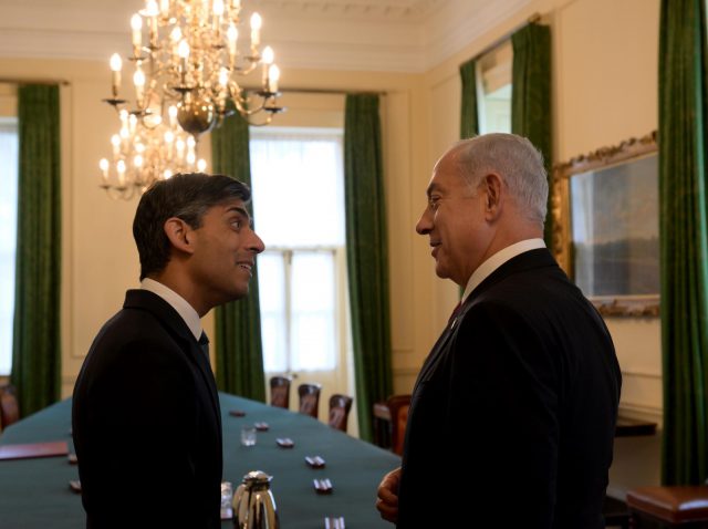 ראש הממשלה בנימין נתניהו נפגש לפני זמן קצר (שישי) עם ראש ממשלת בריטניה רישי סונאק, במעון ראש הממשלה, בדאוניג 10 בלונדון.