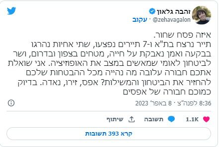 גלאון צייצה: "איזה פסח שחור. תייר נרצח בת"א ו-7 תיירים נפצעו, שתי אחיות נהרגו בבקעה ואמן נאבקת על חייה, מטחים בצפון ובדרום, ושר לביטחון לאומי שמאשים במצב את האופוזיציה".