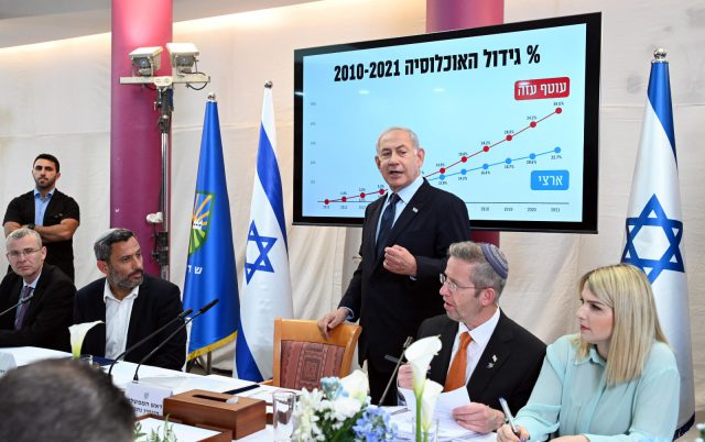 "אני רוצה להראות לכם, לפני שנדבר על מה אנחנו עושים היום, מה הדבר הזה עשה לגידול האוכלוסייה בעוטף עזה. אתם יכולים לראות את זה כאן – גידול האוכלוסייה במדינת ישראל, שהוא עצום בכל קנה מידה עולמי, גדל ב- 22.7%, גידול גדול מאוד במדינת ישראל. הנה הגידול של העוטף, תסתכלו מה קרה בעוטף משנת 2014 – העוטף גדל. אזרחי ישראל באים בהמוניהם ליישובי העוטף, והגידול של האוכלוסייה בעוטף הוא 70% יותר מגידול האוכלוסייה המרשים במדינת ישראל. ב-2014 עם צוק איתן ותכנית החימוש הראשונה, ושוב ב-2021 שומר חומות".