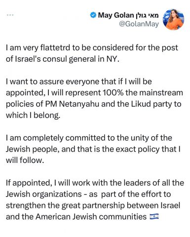 למרות הדיווחים כי ראש הממשלה בנימין נתניהו, רוצה למנות את השרה לקידום מעמד האישה, מאי גולן לקונוסלית ישראל בני יורק, נראה כי המינוי לא ייצא לפועל, כך דיווח הערב כתב ישראל היום יהודה שלזינגר.
