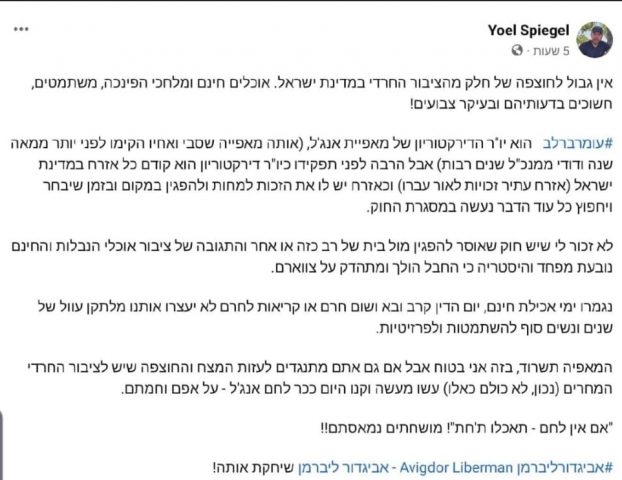יואל שפיגל, נכדו של מייסד מאפיית אנג"ל כתב פוסט תוקפני ומסית נגד הציבור החרדי בעקבות החרם אותו יזמו על מאפיית אנג"ל. בטקסט הקשה נכתב על הציבור החרדי כי הם אוכלי חינם ומשתמטים. שפיגל הוסיף "יום הדין שישים סוף לפריזיטיות ולהשתמטות קרב".