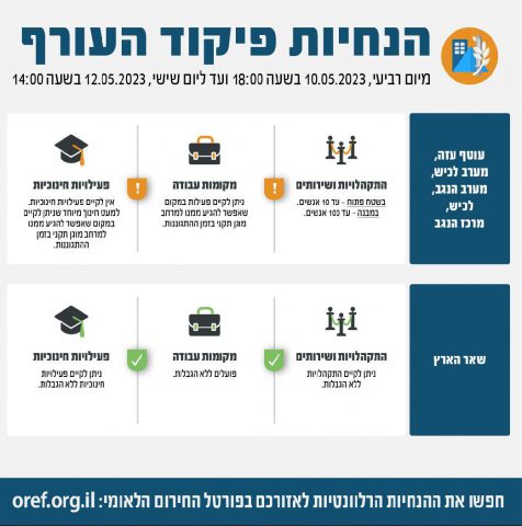 לפי פיקוד העורף ההנחיות תקפות החל מיום רביעי, 10 במאי 2023 בשעה 18:00 ועד יום שישי, 12 במאי 2023 בשעה 14:00.