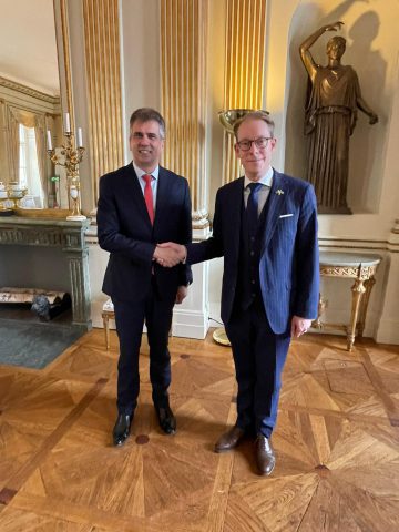 שר החוץ אלי כהן הגיע היום (ב') לפגישה ראשונה בבירת שוודיה, שר החוץ כהן נפגש עם שר החוץ השוודי טוביאס בילסטרום. זוהי פגישתם השנייה של השניים, אשר נפגשו מוקדם יותר השנה במסגרת הפורום הכלכלי הבינלאומי בדאבוס. ופגישה ראשונה של שרי החוץ של המדינות בשוודיה מזה מעל ל22 שנים.