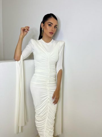 השמלה, של בית האופנה מרגוט בעיצוב שירן מרגוט ואלה קליסקי, מאופיינת בכיווצים לאורך כל חלקה הקדמי, מה שיוצר מראה אלגנטי יחד עם שרוולים ארוכים ונשפכים.