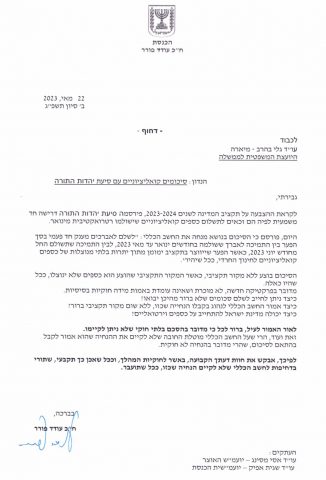 בעקבות ההסכם שנחתם הבוקר (ב') בין רה״מ נתניהו לבין סיעת יהדות התורה באשר לכספים הקואליציוניים, פנה יו״ר סיעת ישראל ביתנו, ח״כ עודד פורר בשם הסיעה ליועצת המשפטית לממשלה, גלי בהרב מיארה.