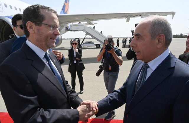 נשיא המדינה יצחק הרצוג ורעייתו מיכל נחתו הבוקר (שלישי) בבאקו, בפתח ביקורם הממלכתי הראשון באזרבייג'ן. עם נחיתתם, הנשיא ורעייתו התקבלו בשדה התעופה במשמר כבוד על ידי נציגים מהצד האזרי ו-30 ילדים מבית הספר היהודי "חב״ד אור אבנר" שבבאקו, אשר שרו לכבודם "הבאנו שלום עליכם".