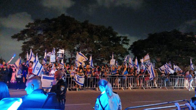 המפגינים צועקים קריאות בעד הרפורמה המשפטית, ו"אנחנו הרוב – יצאנו לרחוב".