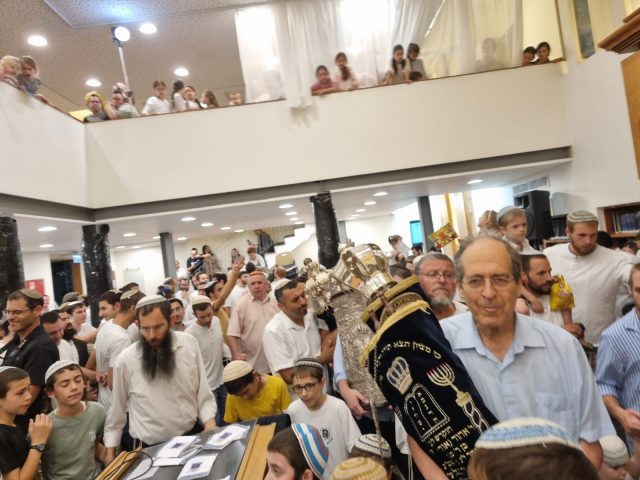 כשהם רוקדים ברחובות תל אביב עם ספר תורה, מאות תלמידי הישיבה, אורחים ובני משפחת רחמני הכניסו ספר תורה להיכל בית המדרש של ישיבת מעלה אליהו בתל אביב.