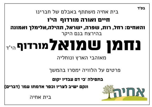 מועצת נחל שורק, בה נמצא היישוב יד בנימין בו גדל נחמן והתגורר בו עם משפחתו עד שעברו לפני כשנה ליישוב אחיה, פרסמה הודעת תנחומים ואבל על הירצחו של נחמן ובה רשמו: "מועצה אזורית נחל שורק מרכינה ראש עם הוודע הירצחו של נחמן מורדוף הי"ד, נחמן רק בן 17 בהירצחו גר עם משפחתו ביד בנימין מהגרוש ועד לפני שנה, אז עזבו למושב אחיה."