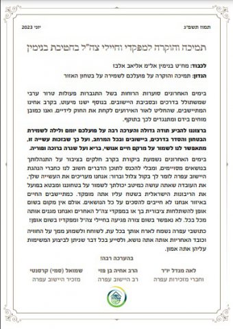 עוד נכתב כי היישוב "רוצה להביע תודה גדולה והערכה רבה על פעילות כוחות הביטחון לשמירת הביטחון והסדר, ועל כך שבזכותם מתאפשר לשמור על שגרת חיי היישוב". בסוף המכתב נכתב כי "תושבי היישוב ישמחו לארח את אלבז בכל עת, לדבר איתו ולסייע בכל דבר שניתן לביצוע המשימות עליהן כוחות הביטחון אחראיים".