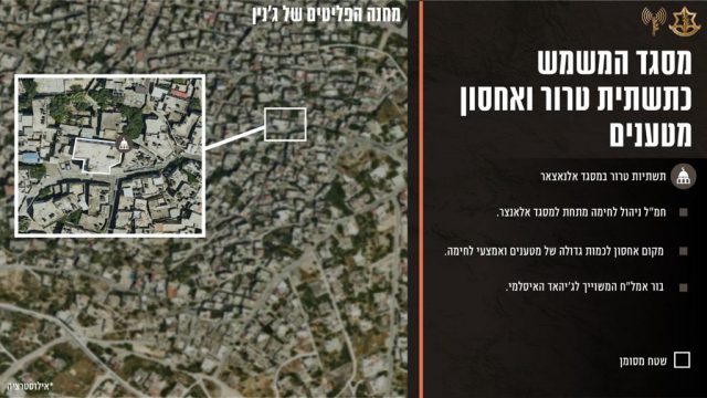 היום זהו היום השני למבצע בית וגן לסיכול הטרור בגזרת ג'נין. עד כה מאז תחילת המבצע, מעל 110 חשודים תוחקרו על ידי כוחות הביטחון, חלקם תוחקרו ושוחררו וחלקם עברו להמשך טיפול כוחות הביטחון. כמו כן אותרו חמש מעבדות נפץ ובהן מאות מטענים, חומרי נפץ ואמצעים לייצור מטענים ושני פירי תת-קרקע בתוך מסגד המזוהה עם ארגון טרור ובו אמצעי לחימה רבים. • בנוסף אותר, היקף גבוה של ציוד צבאי וציוד שמזוהה עם ארגוני טרור – מכשירי קשר, ווסטים, מטעני השלכה, בקבוקי תבערה, אמר״ל.