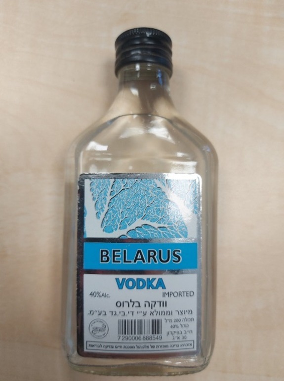 וודקה בלרוס, BELARUS VODKA, תכולה 200 מ"ל, כוהל 40%, מיוצר וממולא על ידי די. בי. גד בע"מ, נושא בר קוד 7290006888549. במוצר זה נמצאה רמת מתנול פי 468 מהמותר.