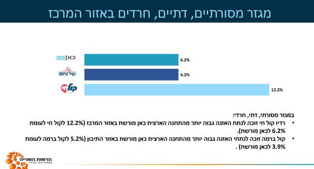 הסקר בחן גם את נתח האזנה של קהלים שונים בקרב תחנות הרדיו האזוריות מגזריות, ביחס לתחנות הרדיו הארציות. תחנת הרדיו האזורית קול חי במקום הראשון בנתח האזנה באזור המרכז (12.2%) לציבור המסורתי־דתי־חרדי, לפני כאן מורשת הארצית (6.2%). גם רדיו קול ברמה מגיע למקום השני ושווה לשיעורי האזנה לכאן מורשת במרכז בקרב המגזר (6.2%).