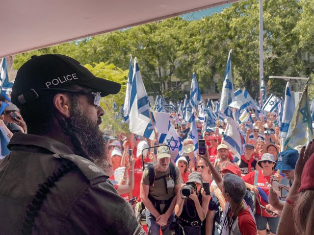 המפגינים שנושאים שלטים ואוחזים בדגלי ישראל ובדגלי תנועת הלהט"ב דופקים על דלתות המשרדים שננעלו. המשטרה לא מצליחה לפנות את ההמון המוסת שמול המשרדים.