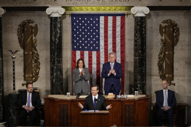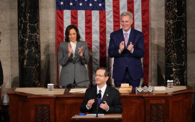 אדוני היושב ראש מקארתי, אני מודה לך על אירוח המושב המשותף והחגיגי הזה של הקונגרס, לרגל חגיגות 75 השנים הראשונות למדינת ישראל. רק לפני שבועות ספורים, במסגרת המסע הראשון שערכת כיושב ראש, כיבדת את העם הישראלי בנאום בפני הכנסת בירושלים, בירת מדינת ישראל והעם היהודי. הידידות הכנה שהבעת בשם ארצות הברית של אמריקה, הדהדה היטב בקרב אזרחי ישראל. תודה לך. סגנית הנשיא האריס, תענוג לראות אותך שוב. אני זוכר היטב כיצד אירחתי אותך בכנסת לפני כמה שנים. דברייך המרגשים בקבלת הפנים בשגרירות ישראל לרגל יום העצמאות הישראלי לפני מספר שבועות, משקפים את הידידות האיתנה וארוכת השנים שלך ושל הנשיא ביידן לישראל.