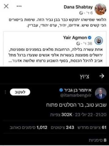 השר בן גביר מסר: "איומים לא מפחידים אותי, אמשיך לפעול למען ביטחון אזרחי ישראל. מודה ליחידת מגן וגורמי הביטחון אשר שומרים עליי ומשפחתי".