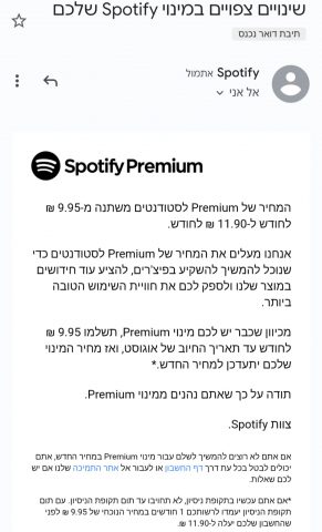 מחירי המנויים בספוטיפיי עלו מ-19.90 ש"ח ל-21.90 ש"ח למנוי ליחיד, מ-25.90 ש"ח ל-29.90 ש"ח למנוי זוגי, מ-31.90 ש"ח ל-35.90 ש"ח למנוי משפחתית ומנוי הסטודנטים עלה מ-9.95 ש"ח ל-11.90 ש"ח.