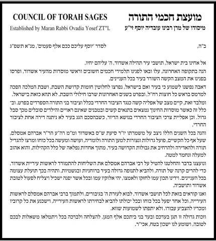 ״ואנו קוראים בזאת לכל תושבי אשדוד, לבוא לעזרת ה' בגיבורים, ולתמוך ברבי אברהם אמסלם לראשות העירייה, וכל אחד יפעל בכל כוחו ובכל יכולתו להביא לבחירתו לראשות העירייה, וישכנע את כל קרוביו ומכריו להצביע עבורו. ולא יתפתו לשמועות שווא", דברי מועצת חכמי התורה.