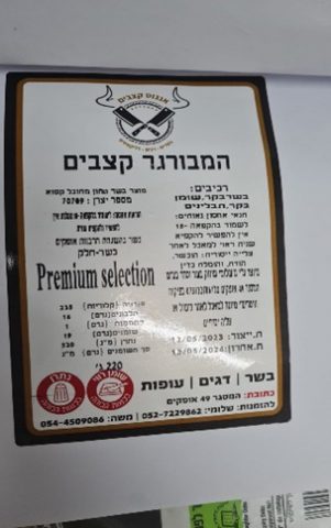 שם המוצר: המבורגר קצבים. שם מסחרי: אנגוס קצבים. שם היצרן: מ.שלומי שיווק בשר וסחר בע"מ.. תאריך תפוגה: לשימוש עד 13/05/2024. תאריך ייצור: 12/05/2023.טלפון שירות לקוחות – 073-7327861.