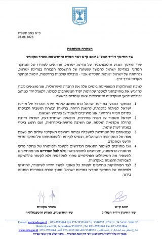 שר החינוך יואב קיש ושר המדע והחדשנות אופיר אקוניס הצהירו הצהירו על התחייבותם לשמירה על חופש האקדמיה במוסדות ההשכלה הגבוהה.