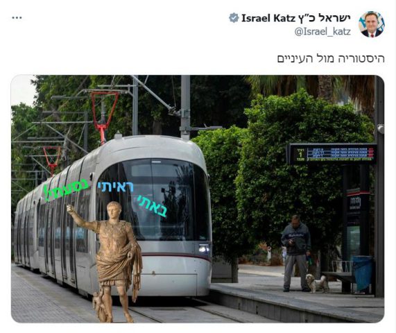 שר האנרגיה ישראל כ"ץ, שוב צייץ תמונה מביכה וחטף מהגולשים. כ"ץ שהיה במשך שלוש קדנציות שר התחבורה וחתם על תחילת העבודות להקמת הרכבת הקלה, ציין באחד הראיונות בעבר שהוא משווה את עצמו להורדוס – מלך ישראל בימי בית שני.