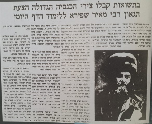 "אולם כשהתחלתי לדבר ארוכות וקצרות בדבר תועלת למוד דף יומי (כי לדעתי תועלת רבה יש בזה אם בכל יום דף גמרא אחד נלמד מרבבות יהודים והוא מגיע השמיימה) באה ההפתעה הגדולה שהרעישה עולמות ממש וכולם הסכימו פה אחד, שהוא בעבור כל אחד מישראל".