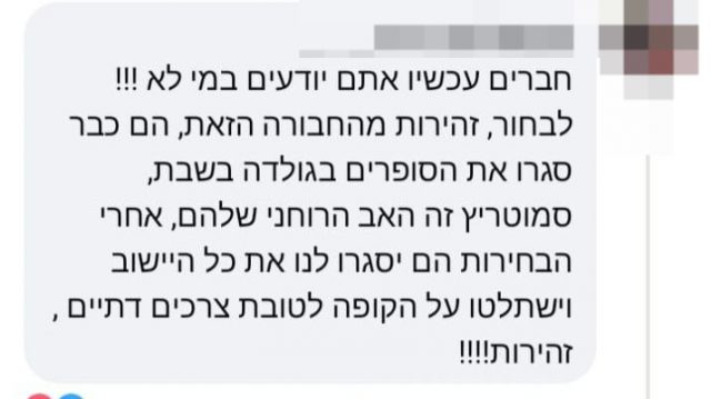 מגיב נוסף הרחיק לכת כשכתב: "אחרי הבחירות הם יסגרו לנו את כל היישוב וישתלטו על הקופה לטובת צרכים דתיים, זהירות!!!!"