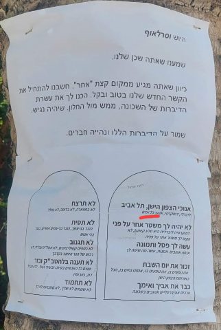 במכתב הסאטירי נגד השר מעוצמה יהודית נכתב: "היוש, וסארלוף. שמענו שאתה שכן שלנו. כיוון שאתה מגיע ממקום קצת "אחר", חשבנו להתחיל את הקשר שלנו בטוב ובקל. הכנו לך את עשרת הדיברות של השכונה, ממש מול החלון, שיהיה נגיש. שמור על הדיברות האלו ונהיה חברים".
