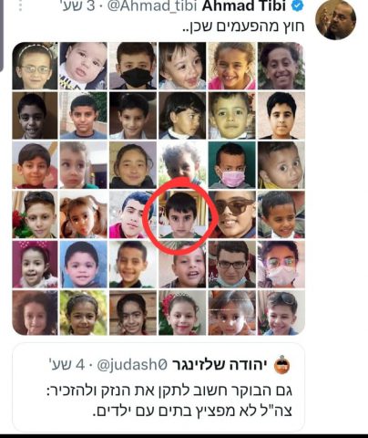 חבר הכנסת אחמד טיבי, ממשיך בהסתה נגד ישראל ופרסם ברשתות תמונה בה לכאורה נמצאים ילדים פלסטינים שנהרגו מירי של צה"ל, אך בתוך התמונה המסיתה, נמצאה גם תמונתו של עידו אביגל ז"ל, הילד בן ה-5 שנרצח בשנת 2021, לאחר שרקטה שנורתה על ידי חמאס פגעה בביתו שבשדרות וגרמה לפטירתו.