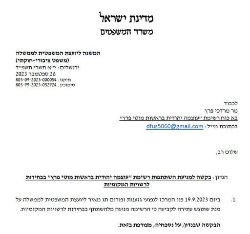 חודש וקצת לבחירות לרשויות המקומיות, היועצת המשפטית לממשלה בוחנת באופן תקדימי בקשה של פסילת רשימת עוצמה יהודית בבחירות לרשויות המקומיות בגין הסתה לגזענות ושלילת אופייה הדמוקרטי של מדינת ישראל.