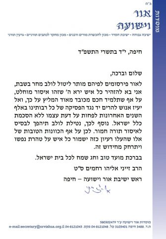 נזכיר, כי לפני שבועיים תקעו בשופר במניין של הרב ישראל אריאל בשבת, וכעת בכוונתם גם ליטול לולב בשבת. מול הכוונה הזו מפרסם ערב החג, רב הטכניון לשעבר הרב זייני – שעומד כיום בראש ישיבת ההסדר בחיפה – גילוי דעת הקורא לציבור להתרחק מכך.