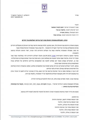 על פי הדיווח של עמית סגל בחדשות 12, במכתב שנשלח ונחתם בין היתר על ידי חברי הכנסת שמחה רוטמן וטלי גוטליב הזכירו החתומים את האלימות נגד מתפללים ביום הכיפורים האחרון. "בשבוע האחרון הזדעזע עם ישראל כולו ואנו בתוכם לגלות מציאות חדשה במדינת ישראל בה מתפללים יהודים מוכים ומושפלים במרכזה של העיר העברית הראשונה תל אביב בעוד שמשטרת ישראל עומדת מנגד".