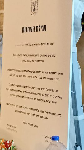 בכניסה לסוכה הוצבה מגילת האחדות עליה חתומים חברי הכנסת מיכל וולדיגר וחילי טרופרו בה נכתב בין היתר: "אנו מאמינים כי יש לחזק את ערכי הסובלנות, האכפתיות והאחריות החברתית בקרב אזרחי ישראל מתוך הכרה בתרומתם ליצירת חברה צודקת ושיוויונית".