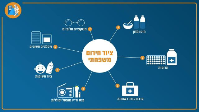 רשימת הציוד כוללת: מלאי מים של 3 ליטרים לאדם ליום למשך 72 שעות, מלאי מזון יבש ומשומר, אמצעי תאורה או פנס המופעלים על סוללות, אמצעים לקבלת התרעות ועדכונים – רדיו הפועל על סוללות, וסוללות ניידות לטלפונים ניידים, תרופות, ערכת עזרה ראשונה, מסמכים אישיים, תעודות וכסף מזומן, וציוד לתינוקות או בעלי חיים, בהתאם לצרכים של בני המשפחה.