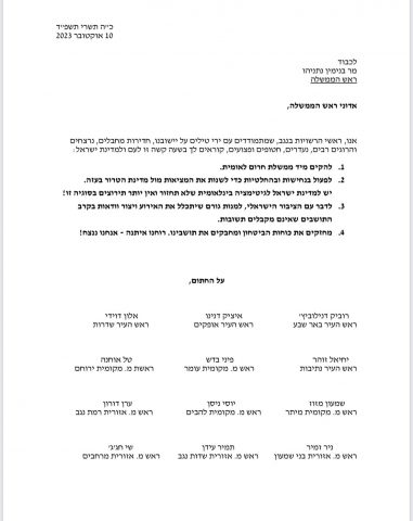 במכתבם נאמר: "אנו ראשי הרשויות בנגב שמתמודדים עם ירי טילים על יישובנו, חדירות מחבלים, נרצחים והרוגים רבים, נעדרים, חטופים ופצועים, קוראים לך בשעה קשה זו לעם ולמדינת ישראל להקים מיד ממשלת חירום לאומית".