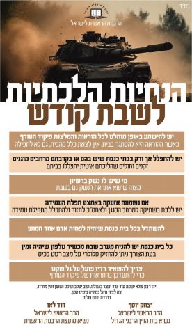 "לקראת השבת הקרובה הבעל"ט אנו מוצאים לנכון ליתן את הדרך ילכו בה ואת המעשה אשר יעשון, כיצד להתנהל בשבת. וכמובן ישנן הוראות שאינן רק לשבת אלא נוגעות גם להתנהלות בעת מלחמה בימי החול" כותבים הרבנים לישראל בדף הנחיות לציבור.