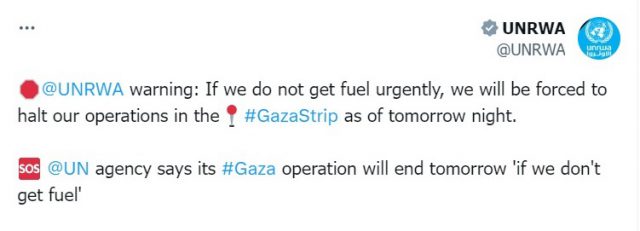 בהודעה שפרסמה בערוץ השייך לסוכנות בטוויטר נכתב: "אזהרה: אם לא נשיג דלק בדחיפות, ניאלץ להפסיק את פעילותנו ב-עזה, החל ממחר בלילה". בתגובה לדברים העלה דובר צה"ל בחשבון הטוויטר שלו באנגלית תמונה של מיכלי דלק השייכים לחמאס וכתב "מיכלי הדלק הללו נמצאים בתוך עזה. הם מכילים יותר מ-500,000 ליטר דלק. תשאלו את חמאס אם אתם יכולים לקבל מהם".