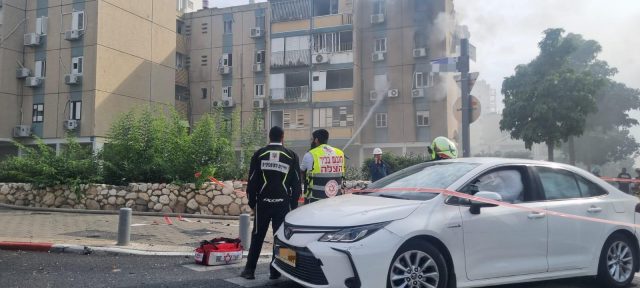 חובשי הצלה שמואל רוטנברג ואלחנן מאמו מדווחים: כשהגענו לזירת הנפילה, מצאנו שלושה נפגעים כתוצאה מפגיעת רקטה בבניין, צעיר כבן 20 עם חבלות בראש ובגפיים במצב בינוני ושלושה נפגעים במצב קל, והם פונו להמשך טיפול בבית החולים איכילוב בעיר.כמו כן אנחנו הענקנו סיוע ראשוני למספר נפגעי חרדה במקום."