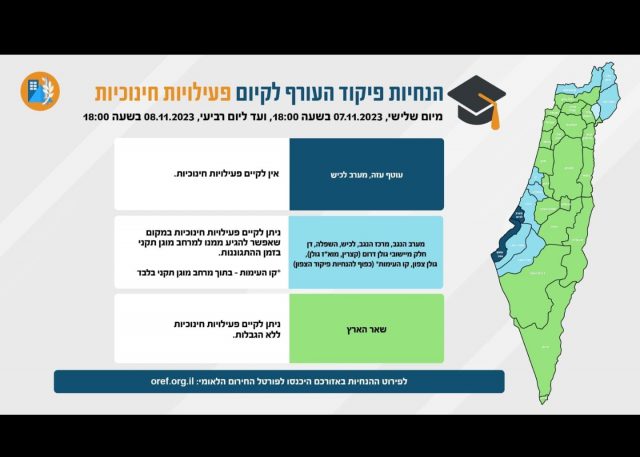 בפיקוד העורף הודיעו כי החל ממחר ניתן יהיה לקיים לימודים ללא מגבלות, בין האזורים שנוספו לרשימה זו הם אזורי הירקון, שפלת יהודה והאזור הבולט ביותר הוא ירושלים, שצורף לאזורי הלימוד והפעילויות הלא מוגבלות, על כן נכון למחר ניתן יהיה לקיים לימודים ופעילויות חינוכיות באזורים אלו ללא הכנות או התחשבויות מיוחדות.