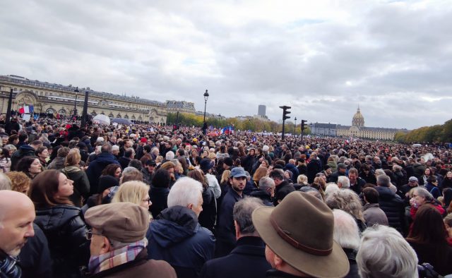בנוכחות חלק גדול מהמעמד הפוליטי הצרפתי, כולל הימין הקיצוני, אבל בלי ראש הממשלה או נציג מהאופוזיציה של השמאל הרדיקלי.